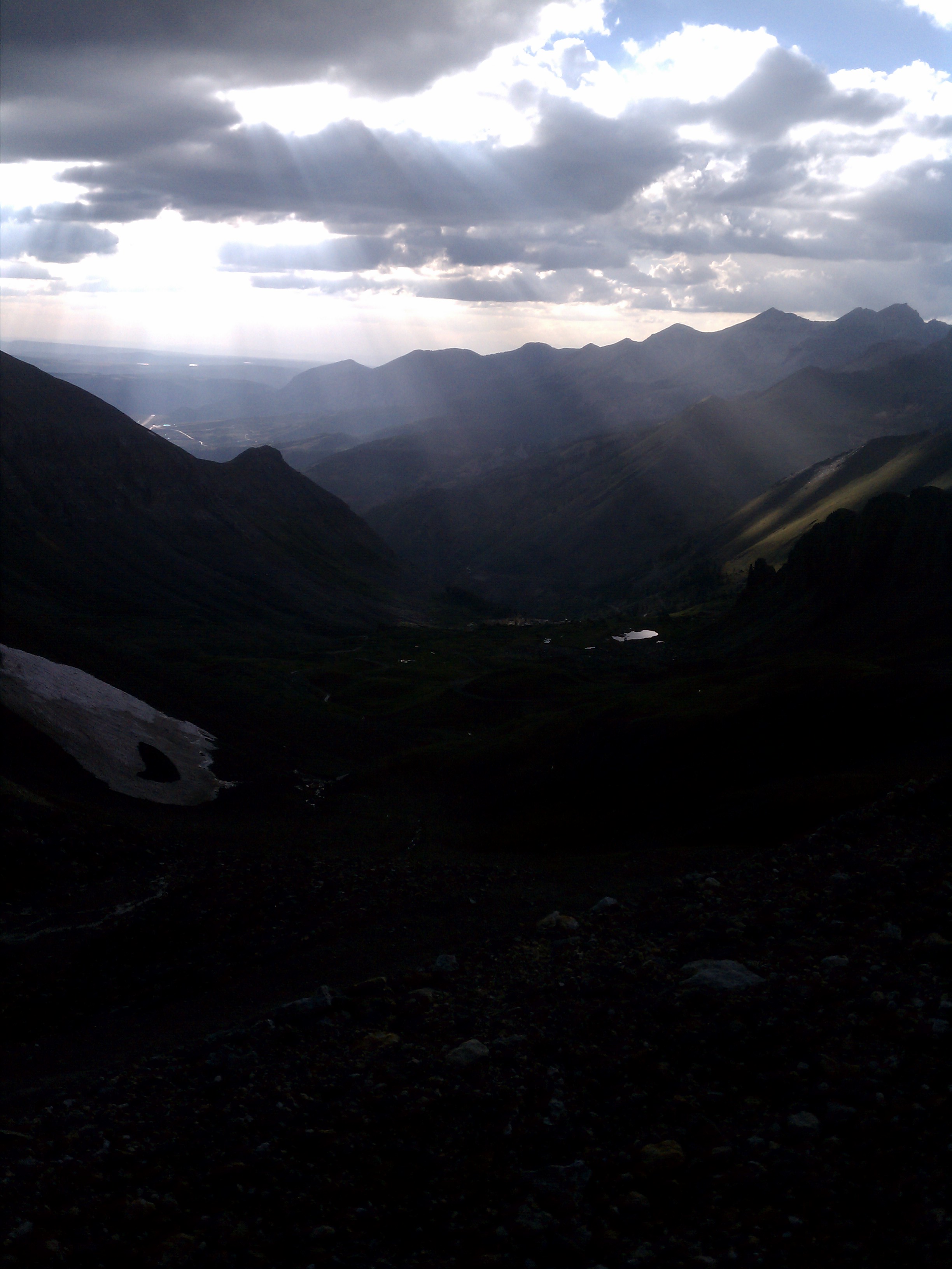 We are standing at the top of Imogene Pass witnessing the longest lasting set of god-rays (haloed fingers from the sun) I’ve ever seen. As their angle widens further and further, we stare, silenced, this speck of us on the talus field surrounded by bits of moss and tiny, hardy plants. This speck of us perched on an equally tiny road carved into gigantic jags of granite.